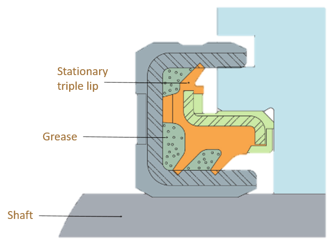 • “Metal shield” rotating with shaft AND grease packed lip seal