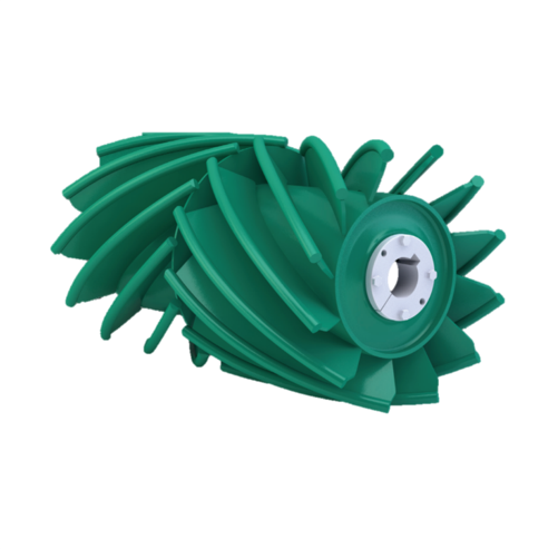 The PPI Herringbone Wing® was designed for those applications where conventional wings suffer from excessive material lodging and wing folding. The extreme wing angles of up to 45°, use the pulleys rotation to eject material out the sides of the pulley rather than recirculating it as a conventional wing often does. These extreme angles and optimized wing height, along with a center reinforcement disc, all combine to make an incredibly strong design that excels where others fail.