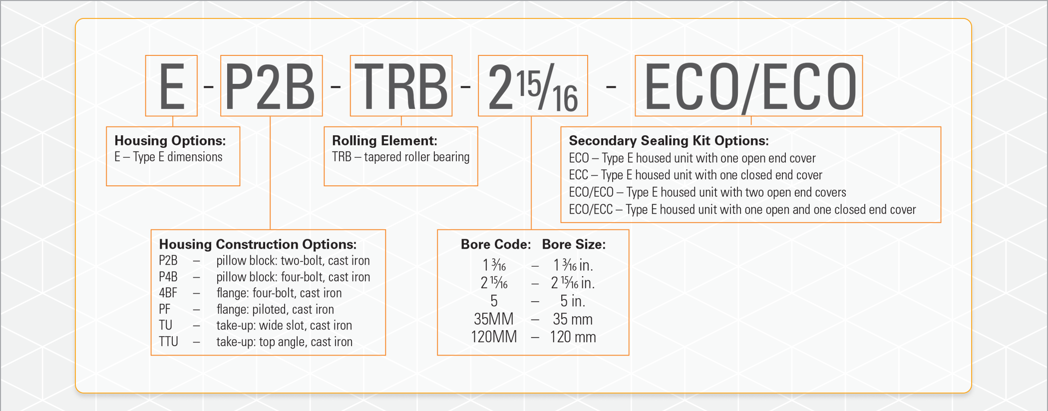Available Size OptionsTimken®'s Type E Tapered Roller Bearing Housed Unit Secondary Sealing System Nomenclature: