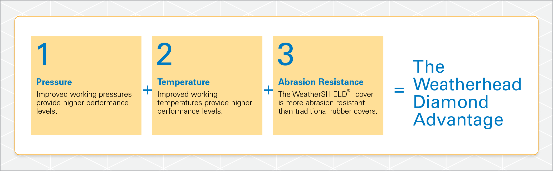 WeatherheadSHIELD™ covers promote better abrasion resistance – more resistant than the traditional rubber covers. Diamond Advantage hose products are indicated by this diamond on the hose layline.
